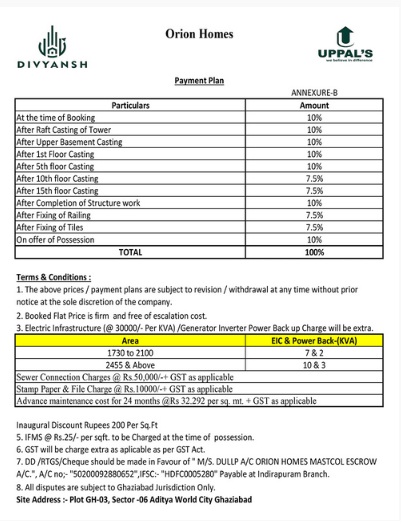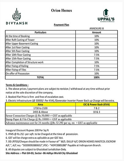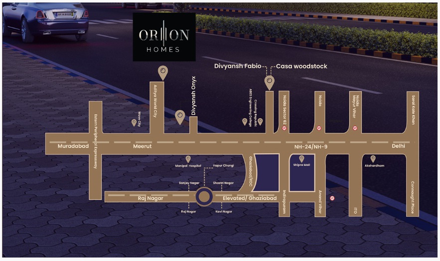Divyansh Orion Homes presents luxury dream home apartments on the bank of 16-lane national highway NH24, and the national expressway NE03 Ghaziabad that ensure broader connectivity to Meerut, Haridwar, and various premium natural destinations in North India and central India. These residences are being designed and developed by the world-famous Divyansh Homes and UPPAL. It would ensure smart living and a smart choice for modern investors and buyers. Being a blissful modern living in a high-paced modern such huge acres of beautiful, green grassland make Divyansh Orion Homes NH24 guarantee good biodiversity. The location of this plot is excellent in terms of connectivity to other business areas, residential areas, hospitals, corporate offices, MNCs, public buildings, well-constructed financial sports facilities, green spaces, farmland, Delhi Metro, corridors, ISBT, bus stops, Rail Network, Airports, schools, colleges, and universities. From a strategic standpoint, this property is in the ideal position and offers easy access to New Delhi, Chandigarh, Haridwar, and other popular places in Uttar Pradesh and Uttrakhand.